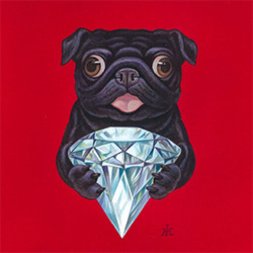 ペチュラはキラキラ光る硬い石が大好きで、お散歩中に拾った石を大切に大切にクッションの下にコレクションしているそうです。その中に、なんとアーモンドサイズのダイヤモンドが混じっていました。 PETULA®︎のアイドル、黒パグPETULAちゃんも、キラキラと光るおおきな石をだきしめています。