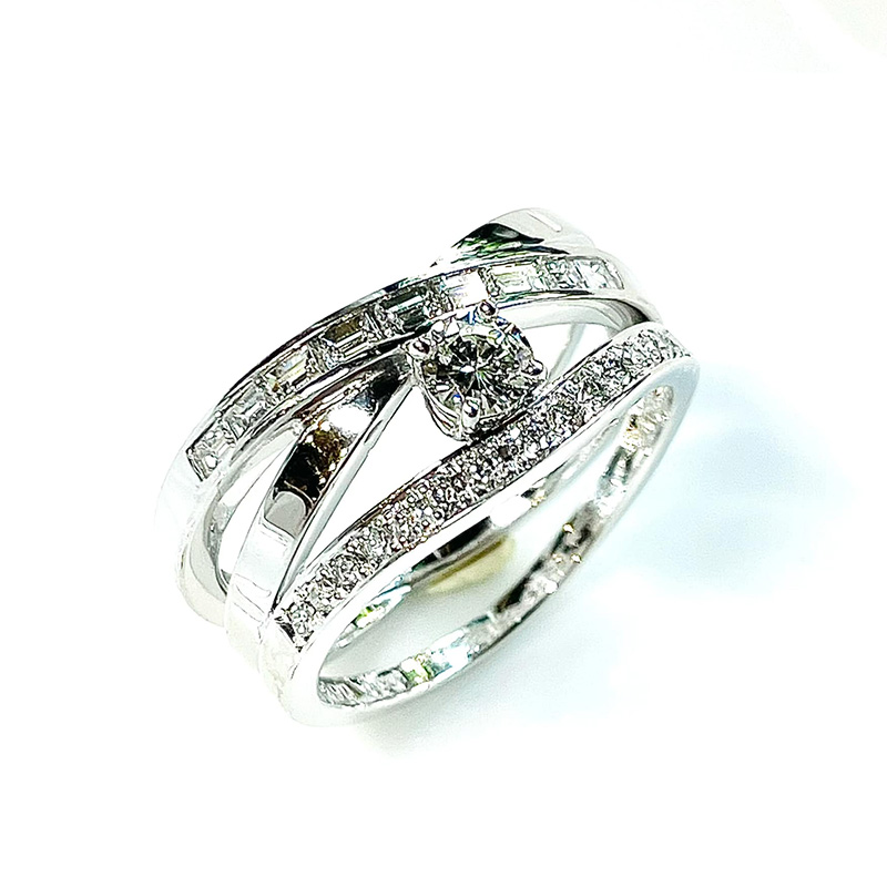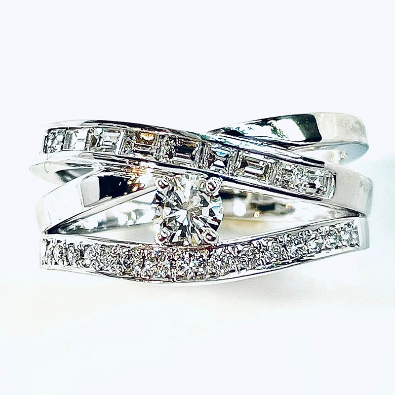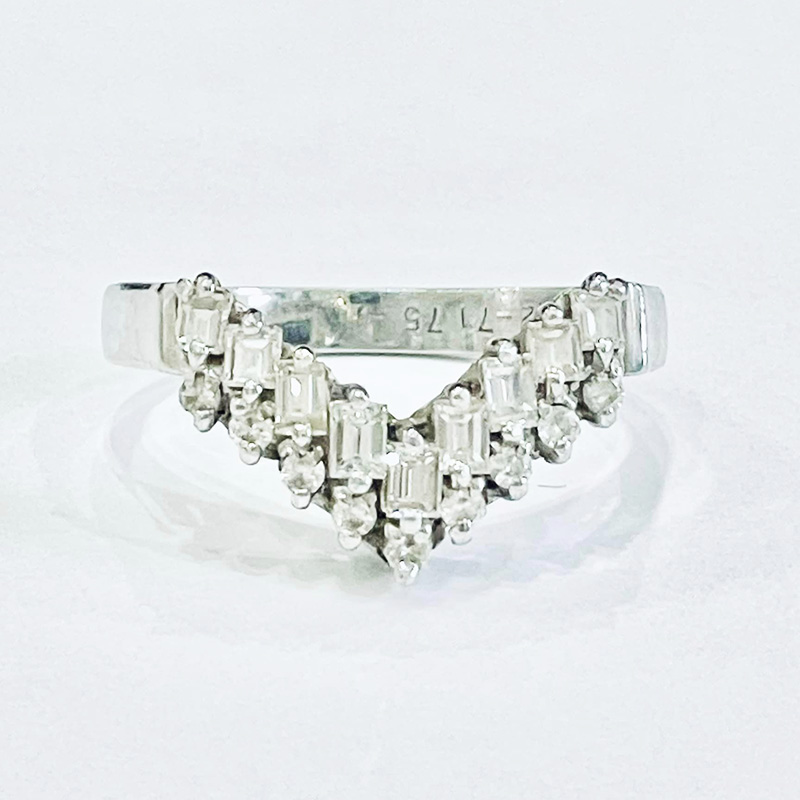 立て爪だったセンターストーンは元来が美しい石ですので、一際華やかに、波打つ大海原に光る星のようです。手前にくる波にはV字リングから外した石を並べ、ラウンドプリリアントカットのライン、バゲットカットのライン、そして地金だけのラインの波がうねったリングが出来上がりました。