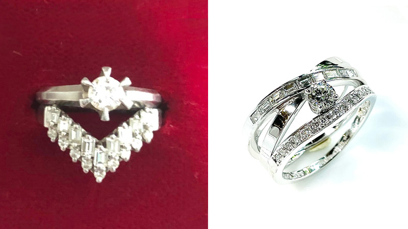 昔の婚約指輪とそれに合わせたV字のリング。確かにこういう組み合わせは昔流行していましたね。婚約指輪として主流だった0.3カラットくらいの立て爪リングだけだと、いかにも婚約指輪感が強いうえに、年齢を重ねると単体では地味に感じるようになると、二つ合わせて華やになるようなV字リングを買い足すという方もよくいらしたように思われます。